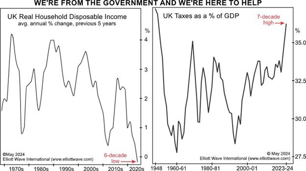 As mood waxes negative and economies worsen, governments will attempt to reverse the decay. The two charts below, however, are a good example of our long-standing view that government measures can only ever worsen financial conditions. Despite a six-decade downtrend in disposable income across UK households, total taxes as a percentage of GDP have risen to a seven-decade high. (You read that right: Taxes in the UK are now worse than the mid-1960s when the Beatles released “Taxman”!)