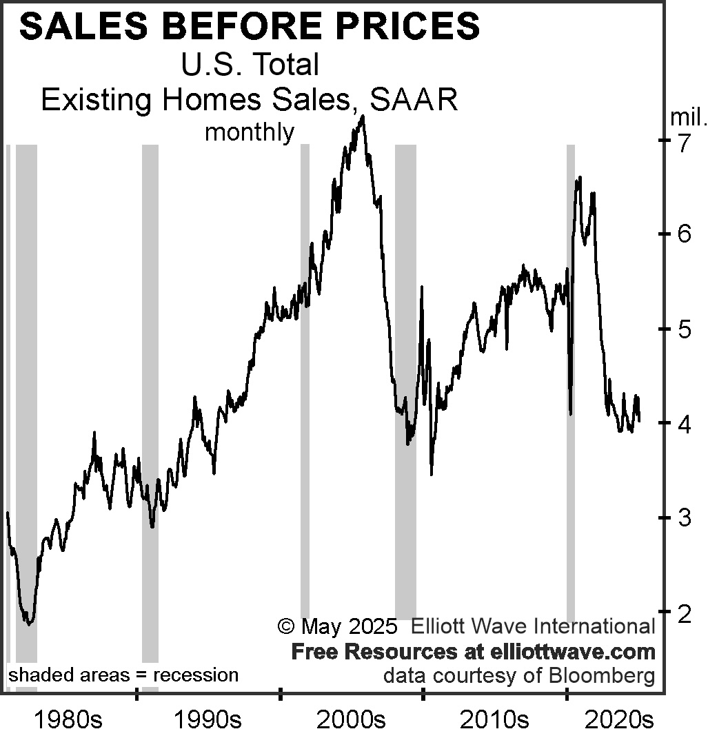 Economists still envision a rosy future for residential real estate. “Housing Market Shows Positive Signs for Summer 2025,” reported Newsweek. But the long term trend is against the consensus. Various past notices in this section and The Elliott Wave Theorist offer a compendium of signs showing a steady housing industry deterioration. In March, for instance, EWT noted that some home prices “have levitated,” but a “looming” real estate debacle is very clear by the performance of U.S. home sales. This chart (below) of existing home sales shows a major decline from January 2021: