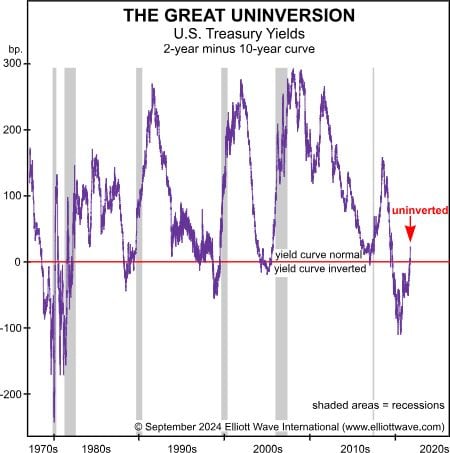 We covered the record-long yield curve inversion in May and August. We have previously noted that since the late 1980s, the yield curve will “uninvert” before the economy starts to contract. The record-long duration of the recent inversion fits EWFF’s forecast for a severe economic contraction this time. Since the stock market leads the economy, the progressing wave pattern of the major indices will be the best indicator of when the economic retrenchment begins. So far, stocks have not signaled an economic cliff-dive. The next time stock indexes drop 20%, a recession will be underway.