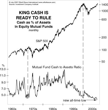 [An] important measure of sentiment that is showing a historically unprecedented level of optimism is the percentage of mutual fund cash levels relative to assets. Mutual fund cash dropped to just 3.6% in March [2007.]