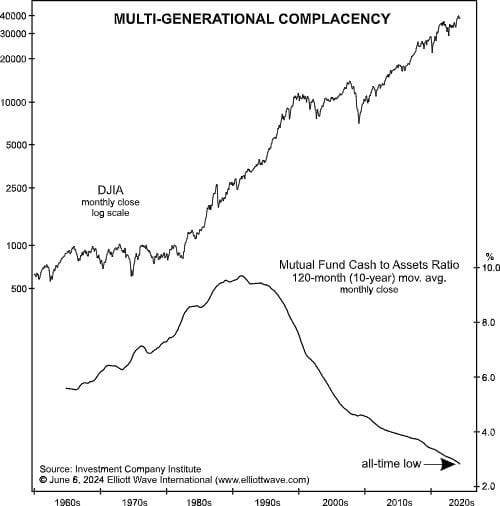 [In] 1991, the average ten-year cash level [of mutual funds] rose to just shy of 10%. After that, mutual fund managers stopped waiting for bargains. For the past 33 years, even through the bear market and Great Recession of 2006-2012, cash levels have decreased on a long term basis, reaching the 2.8% mark, an all-time low.