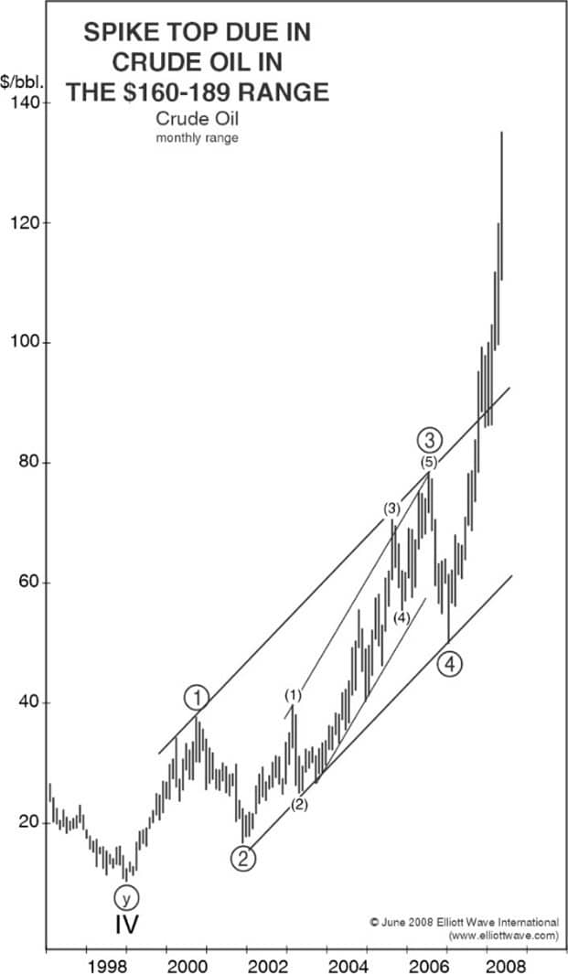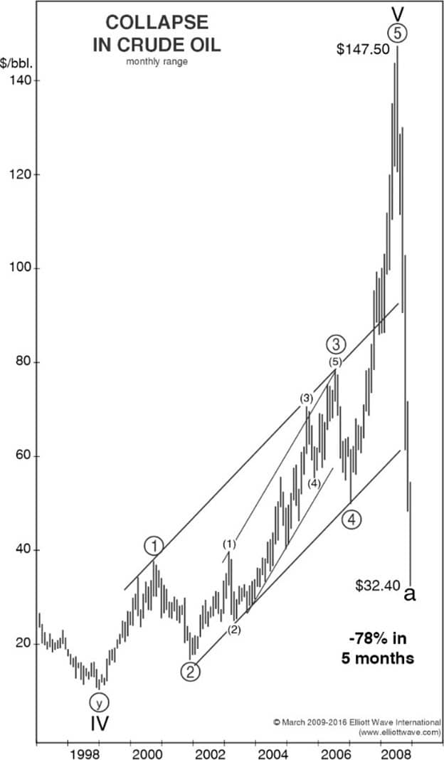 As oil was soaring in the fifth wave of a decade-long uptrend, 97% of analysts were bullish. Commentators and economists announced there was a shortage of oil and called for $200 a barrel. But a full month before crude’s peak, on June 8, 2008, The Elliott Wave Theorist warned subscribers: